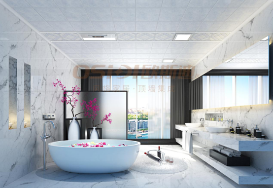 1.漂亮“頂”:區(qū)別于以往廚衛(wèi)吊頂上生硬地安裝浴霸或換氣扇或照明燈后的效果,集成吊頂安裝完畢后看到的不再是生硬組合,而是美觀協(xié)調(diào)的頂部造型。