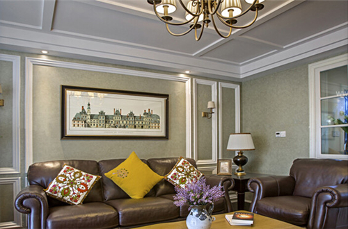 這是一款美式鄉村風格的客廳裝修,整個空間不僅顯得豪放大氣,同時彰顯著濃郁的浪漫氣息,客廳吊頂采用白色的石膏線打造,流暢干練的線條塑造出一個個方形的小格空間,是整個空間顯得極具層次感。